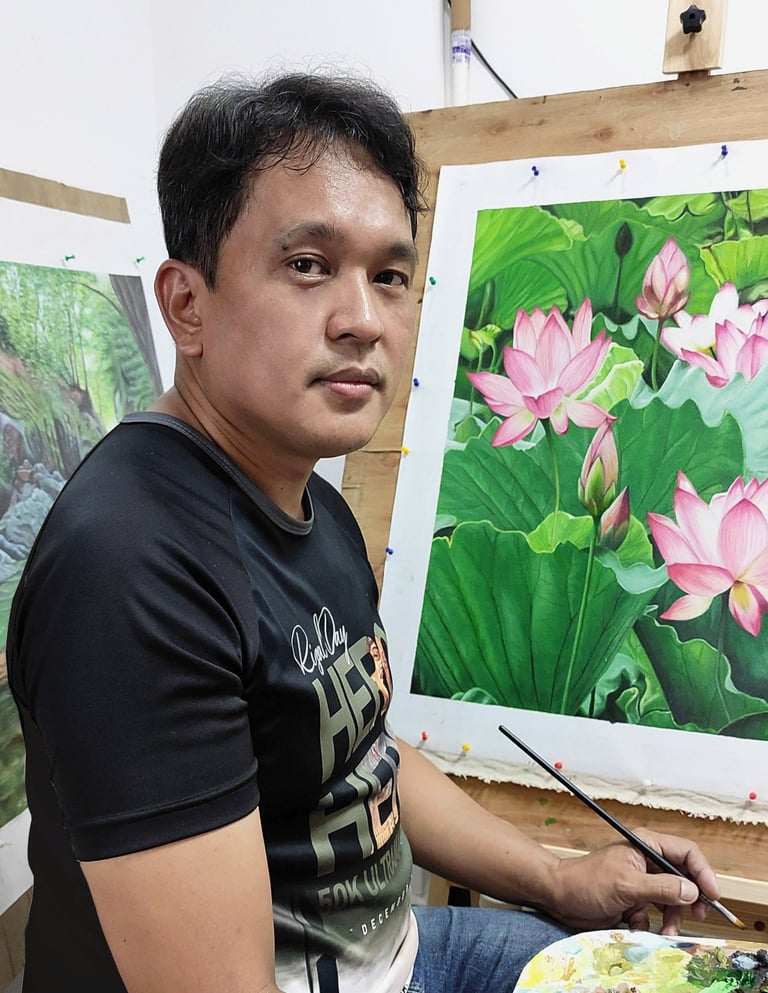 Professionally, Sonny has engaged with different commercial art forms: from product and label designs to Styrofoam sculptures, in-store visual displays, murals, and folk art for public utility jeepneys. These days, he works as a product art designer in China while devoting most of his free time creating his next masterpiece.